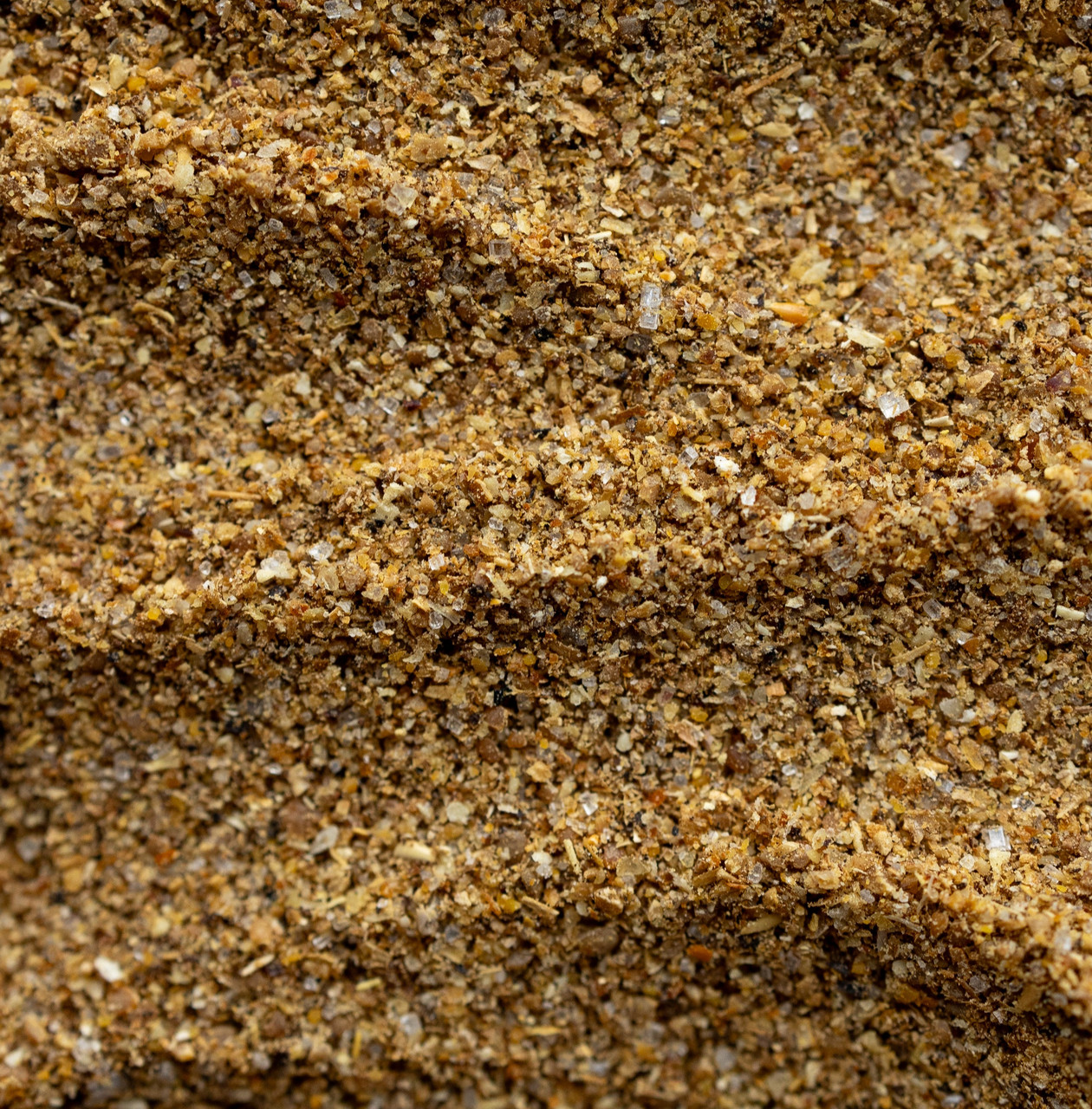 Склад: коріандр мелений, перець чилі мелений, паприка мелена, часник, лавровий лист мелений, гірчиця біла мелена, перець чорний мелений, куркума, хмелі-сунелі мелений, каррі.